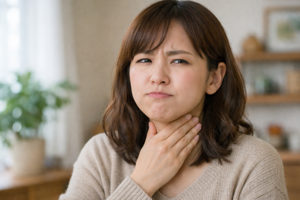 人前で話す前や忙しい時期など、緊張が続く場面で症状を感じやすい人もいるようです。こうしたときは、無意識のうちに肩や首に力が入り、喉まわりの筋肉もこわばりやすくなると言われています。また、疲労がたまっている状態では、体の回復力が落ち、普段は気にならない感覚を強く意識してしまうこともあるようです。これらのケースでは、体の緊張をゆるめることが症状の軽減につながる可能性があると考えられており、まずは生活リズムや休息の取り方を見直す視点が大切だとされています。