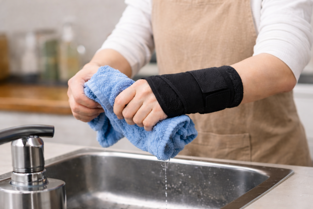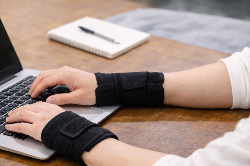 また、手首だけでなく、腕や肩、姿勢など周囲の使い方が影響している可能性もあると言われています。デスクワークや家事など、同じ動作が続いている場合、サポーターで手首を支えていても、負担の原因が別の場所に残っているケースもあるようです。