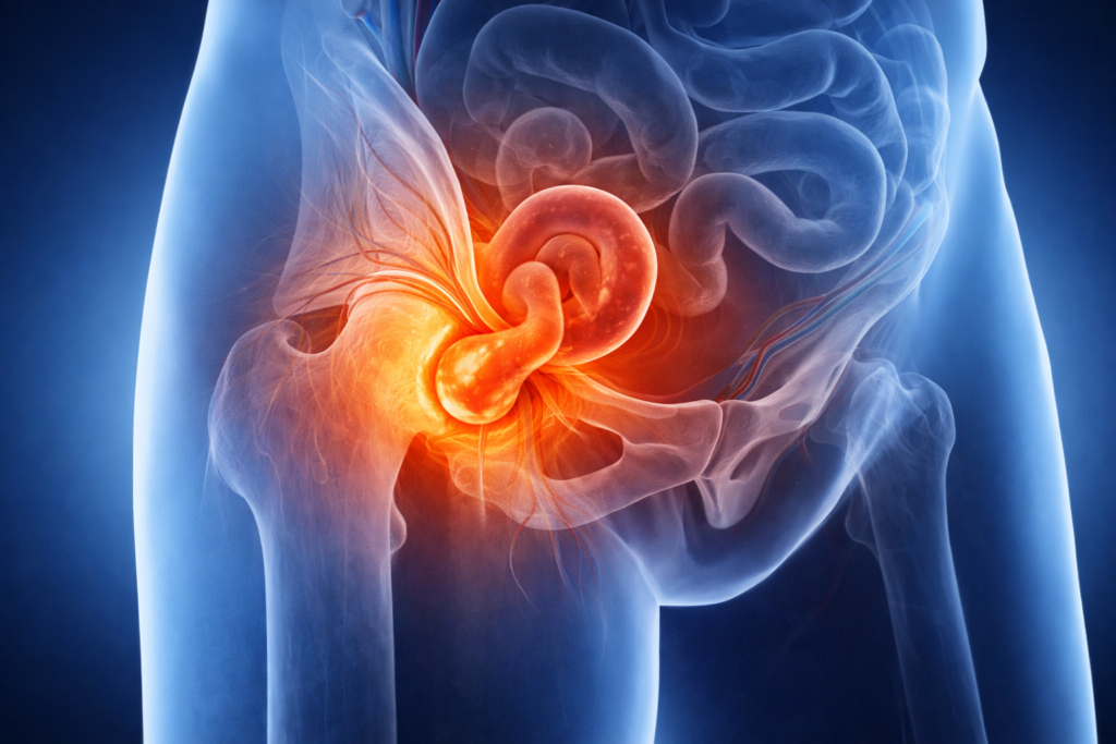 「立ち上がると足の付け根が気になる」「触るとコリッとしたものがある」──そんなときに考えられるのが**鼠径ヘルニア(脱腸)**です。お腹の圧がかかった際に、鼠径部に膨らみや痛みを感じやすいと言われています。横になると落ち着く一方、立位で再び違和感が出るケースがあるようです。